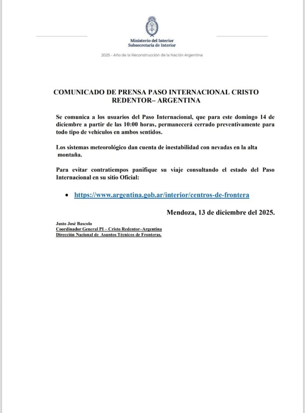 "Se comunica a los usuarios del Paso Internacional que este domingo 14 de diciembre a partir de las 10 horas, permanecerá cerrado preventivamente para todo tipo de vehículos en ambos sentidos", detalla el comunicado oficial.