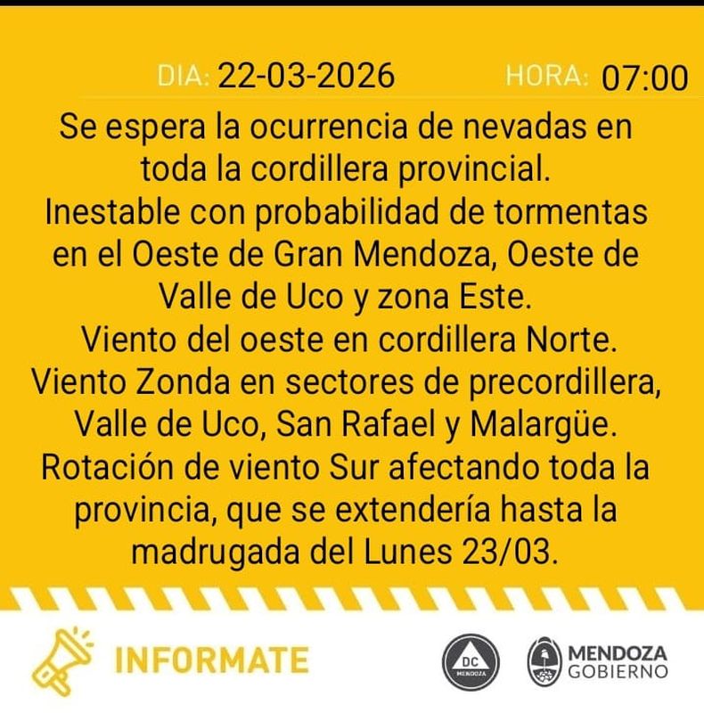 Lo más relevante del día estará dado por las alertas vigentes. Por un lado, rige una alerta por viento Zonda que afectará al Valle de Uco y Malargüe. Según el Servicio Meteorológico Nacional, el fenómeno se presentará con velocidades entre 30 y 45 km/h, con ráfagas que podrían alcanzar los 65 km/h. Este tipo de viento puede provocar reducción de la visibilidad, aumento repentino de la temperatura y condiciones muy secas.