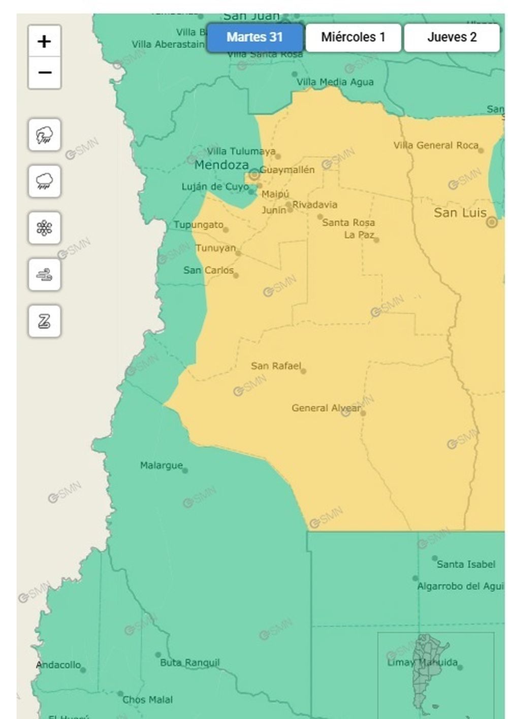 Desde las 16 se prevé inicio de convección en el Oeste del Gran Mendoza y Oeste de la zona Sur, extendiéndose hacia el Valle de Uco, zona Sur y posteriormente zona Este. Es muy probable la ocurrencia de lluvias en el Gran Mendoza a partir de las 21, extendiéndose a toda la provincia durante la madrugada.