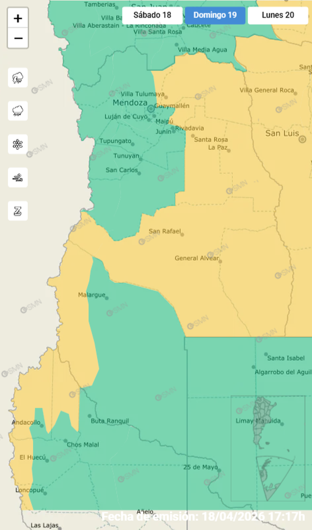 Desde Dirección de Contingencias Climáticas advirtieron sobre la probabilidad de tormentas que abarcarían los tres oasis productivos de la provincia -Norte, Centro y Sur-, lo que eleva el nivel de atención para actividades al aire libre y sectores sensibles a eventos climáticos.