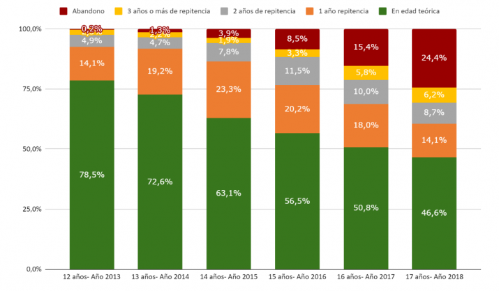 La primera cohorte analizada en el informe es la de los estudiantes que tenían 11 años en 2012. A los 17 años (en 2018), un 24,4% de estos alumnos habían abandonado la escuela, mientras que solo el 46,6% se encontraban en edad teórica (es decir, en el curso correspondiente a su edad). El resto de los estudiantes tenían distintos niveles de sobreedad por haber repetido: un año (14,1%), dos años (8,7%), o tres o más (6,2%).
