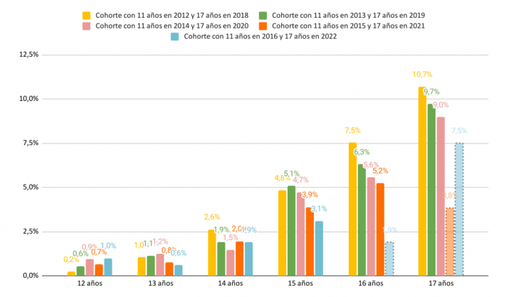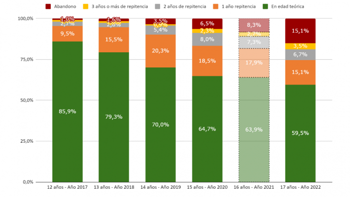 Cuatro años después, para la cohorte de los estudiantes que tenían 11 años en 2016, las cifras habían mejorado. A los 17 años (en 2022), un 15,1% de estos alumnos habían abandonado la escuela, mientras que el 59,5% se encontraban en edad teórica. El resto de los estudiantes habían repetido y tenían un año (15,1%), dos (6,7%), o tres o más de sobreedad (3,5%).