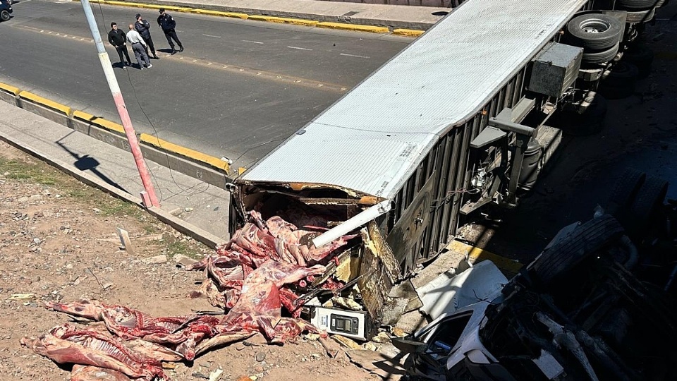 Un violento accidente registrado este lunes por la mañana en el Acceso Este de Guaymallén, a la altura de Cañadita Alegre, terminó con un fuerte operativo de seguridad y una intervención sanitaria que determinó que la carne transportada no podía ser consumida.