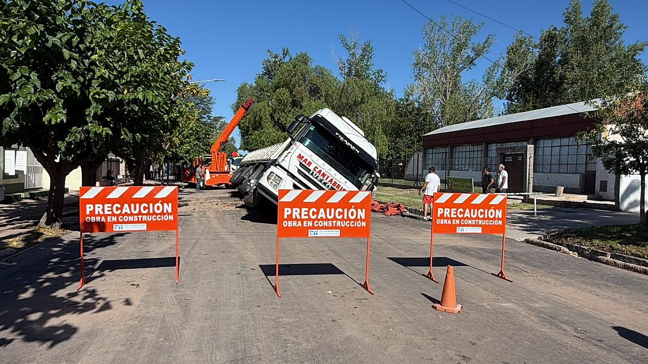 La rotura de un colector de Aysam en calle Alsina, Luzuriaga, provocó que un vehículo de gran porte quedara parcialmente hundido