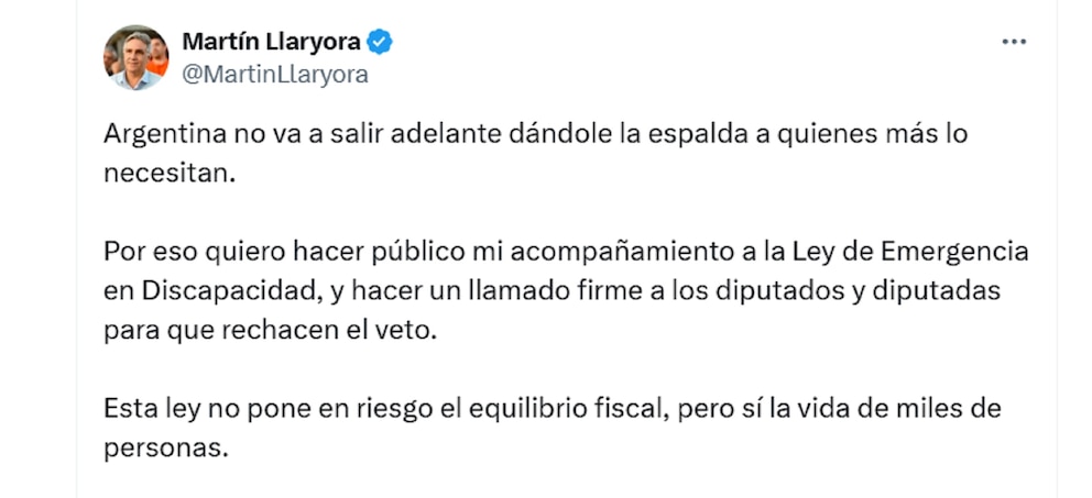 En la oposición se entusiasman con algunos indicios. Por ejemplo, el gobernador de Córdoba, Martín Llaryora, publicó un mensaje en sus redes sociales en el que rechazaría el veto a la emergencia en discapacidad. "Argentina no va a salir adelante dándole la espalda a quienes más lo necesitan", dijo el mandatario provincial. Si bien no dio detalles sobre su posición respecto a las jubilaciones, sus diputados más cercanos votaron a favor de la media sanción.