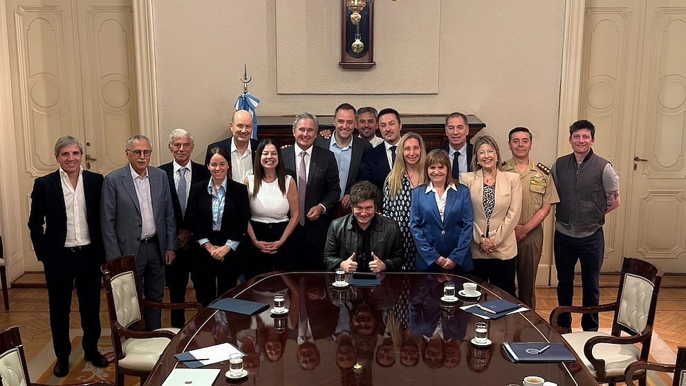 Del encuentro participaron también Federico Sturzenegger (Desregulación), Diego Santilli (Interior), Mario Lugones (Salud), Sandra Pettovello (Capital Humano), Cúneo Libarona (Justicia), Pablo Quirno (Relaciones Exteriores), Petri (Defensa), Luis Caputo (Economía), además de la secretaria Legal y Técnica, María Ibarzabal, la secretaria General, Karina Milei, el asesor presidencial Santiago Caputo, y el titular de Diputados, Martín Menem.