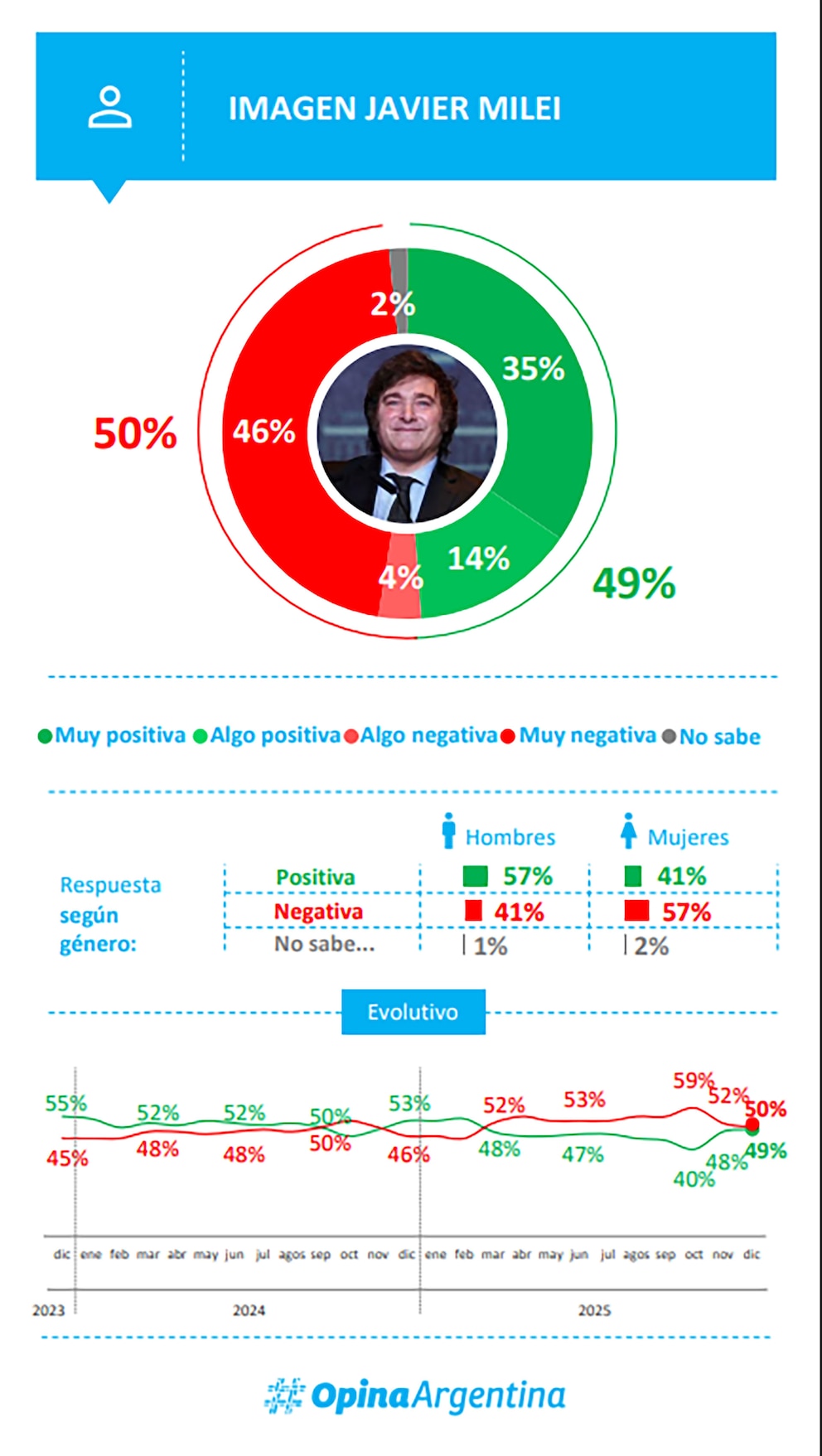 Según esta encuesta, realizada a 1.772 habitantes argentinos mayores de 18 años entre el 1° y el 3 de diciembre en todo el país, la imagen del presidente Milei tiene 49% de consideraciones positivas y 50% negativas. Comparado al relevamiento hecho por esta misma consultora en noviembre, creció un punto su consideración y cayó dos su rechazo.