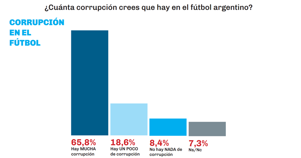 El mismo estudio consultó sobre la percepción de corrupción en el fútbol argentino: el 65,8% respondió que hay mucha corrupción, el 18,6% que hay un poco, el 8,4% que no hay nada de corrupción y el 7,3% no supo o no contestó.