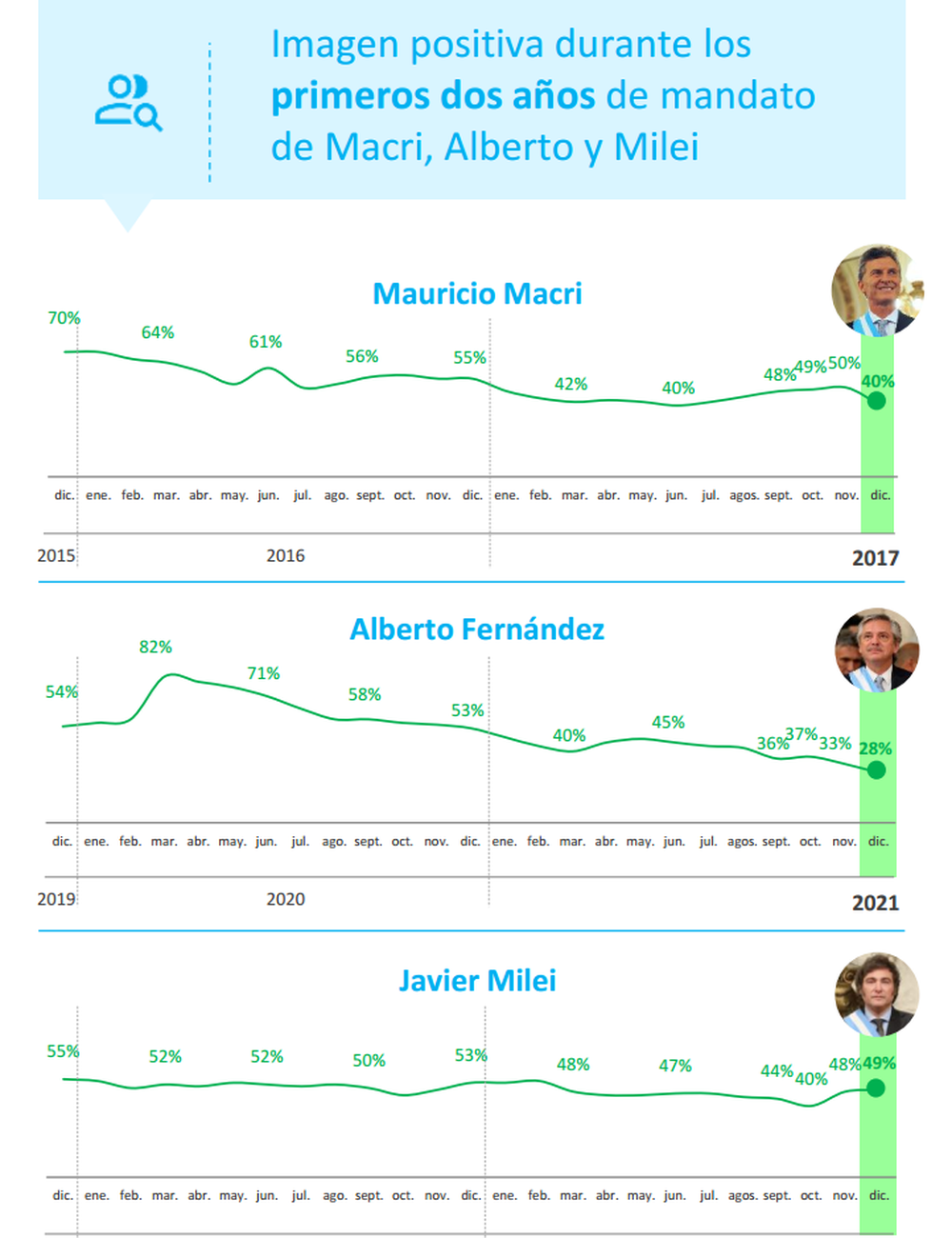 Los datos muestran que Milei supera en 9 puntos porcentuales a Macri y en 21 puntos a Alberto Fernández en la misma instancia de sus respectivos mandatos. Macri había iniciado su presidencia con niveles cercanos al 60% de aprobación pero experimentó una caída gradual. Alberto Fernández, que llegó a la presidencia con 82% de imagen positiva en diciembre de 2019, sufrió un derrumbe acelerado que lo llevó a perder más de 50 puntos en dos años.