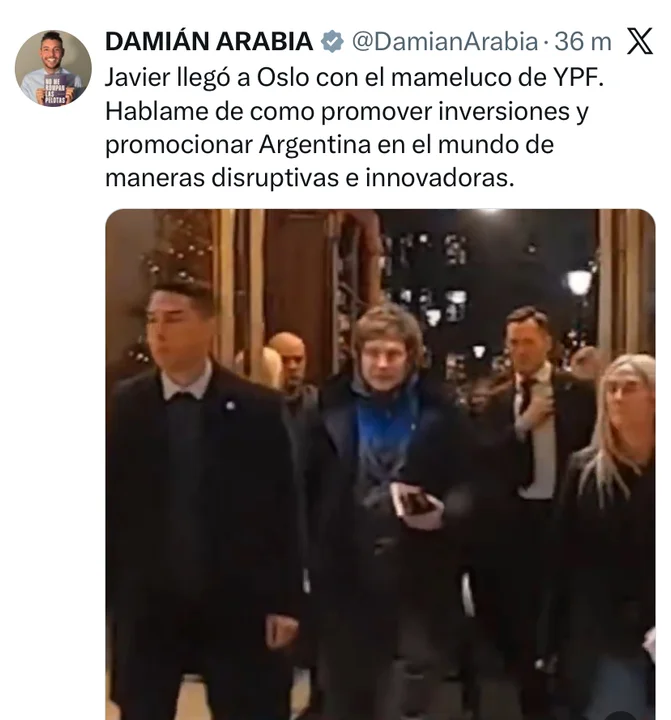 "Javier llegó a Oslo con el mameluco de YPF. Hablame de cómo promover inversiones y promocionar Argentina en el mundo de maneras disruptivas e innovadoras", expresó el legislador desde sus redes sociales.