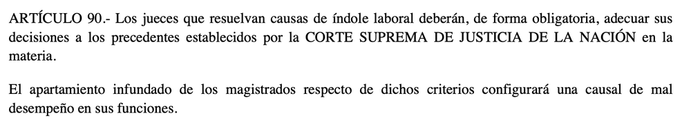 El texto establece que los jueces laborales deberán adecuar sus decisiones a los precedentes de la Corte Suprema de Justicia de la Nación. Pero lo más fuerte es la sanción: el "apartamiento infundado" de dichos criterios será considerado causal de mal desempeño. Es decir, fallar en contra de lo que dice la Corte puede costarle el puesto a un juez. Es una herramienta de disciplina interna inédita en su severidad para el fuero.