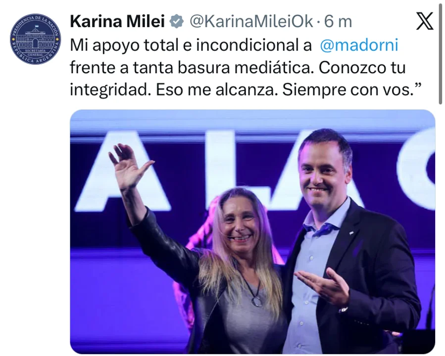 La secretaria general de la Presidencia, Karina Milei, volvió este jueves a usar sus redes sociales para expresar el "apoyo total e incondicional" al jefe de Gabinete, Manuel Adorni, ante las críticas por haber incluido a su esposa en el vieja oficial a Nueva York.