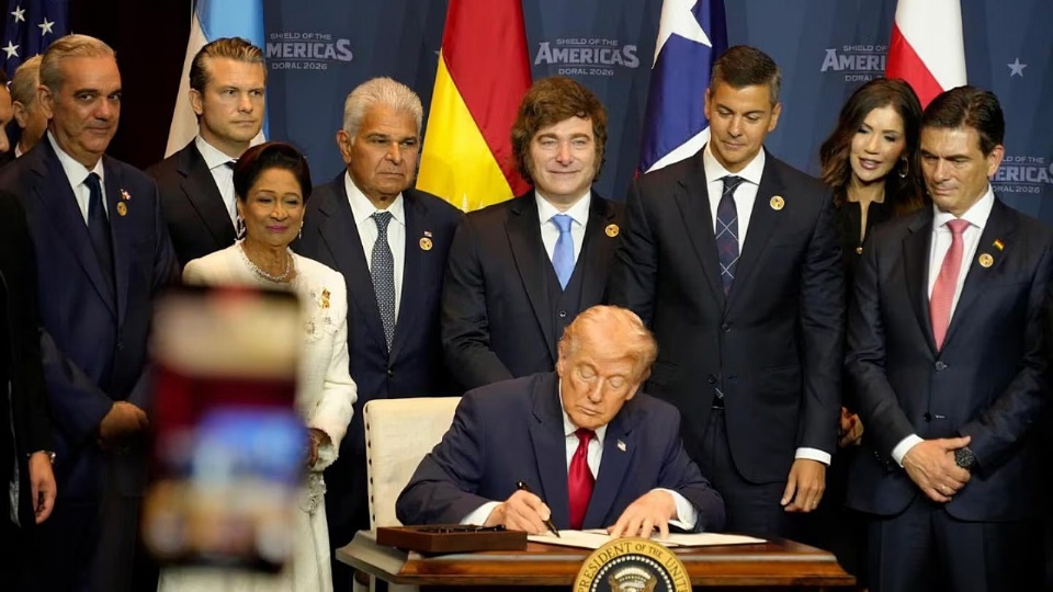 La adhesión argentina se formalizó previamente en una conferencia de defensa realizada en la sede del Comando Sur de Estados Unidos, en Florida, donde el ministro de Defensa, Carlos Presti, firmó una declaración conjunta junto a representantes de otros países del continente. El punto que generó debate interno es la proclama firmada por Trump el 7 de marzo.