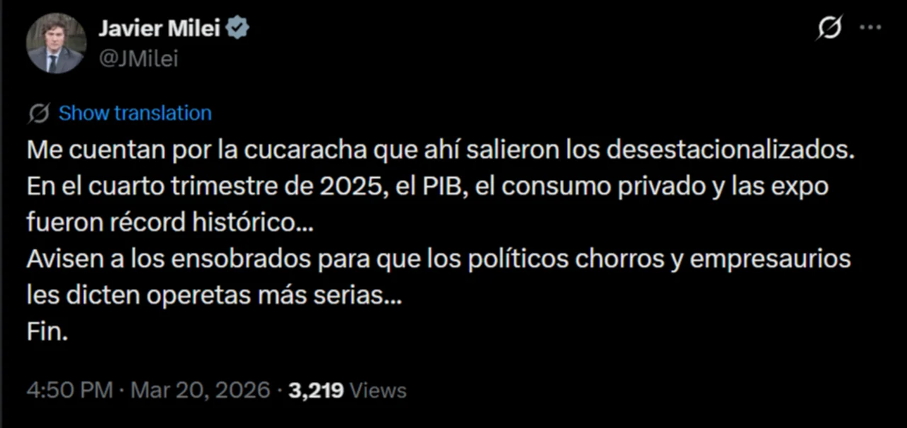 El presidente Javier Milei se refirió al crecimiento del Producto Interno Bruto (PIB) total de 2025 y apuntó, una vez más, contra los "empresaurios" y "políticos chorros".