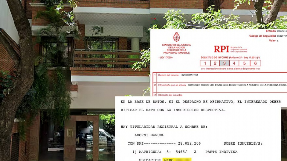 La documentación del Registro de la Propiedad de inmuebles sobre Manuel Adorni