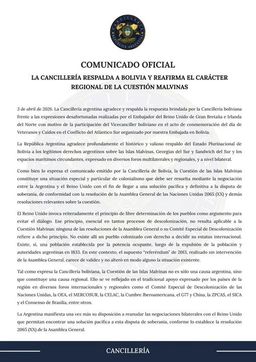 "La Cancillería argentina agradece y respalda la respuesta brindada por la Cancillería boliviana frente a las expresiones desafortunadas realizadas por el embajador del Reino Unido de Gran Bretaña e Irlanda del Norte con motivo de la participación del vicecanciller boliviano en el acto de conmemoración del Día de Veteranos y Caídos en el Conflicto del Atlántico Sur organizado por nuestra embajada en Bolivia", sostuvo la cartera que dirige Pablo Quirno.