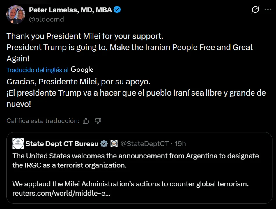 E diplomático norteamericano utilizó sus redes sociales para celebrar la sintonía entre la Casa Rosada y la administración de Donald Trump: "Gracias, Presidente Milei, por su apoyo. ¡El presidente Trump va a hacer que el pueblo iraní sea libre y grande de nuevo!".