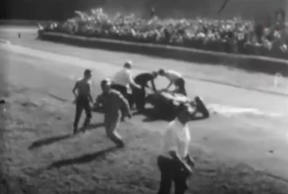 Momento en que se desata la tragedia en la Fórmula 1, cuando el auto del piloto alemán se sale de pista y cae sobre el público.