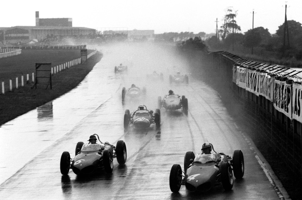GP de Gran Bretaña, Aintree, 15 de julio de 1961. Salida. Ganadores: Wolfgang von Trips (coche 4), Ferrari 156, Ritchie Ginther (coche 6), Ferrari 156, Stirling Moss Lotus (coche 28) y Jo Bonnier, Porsche.